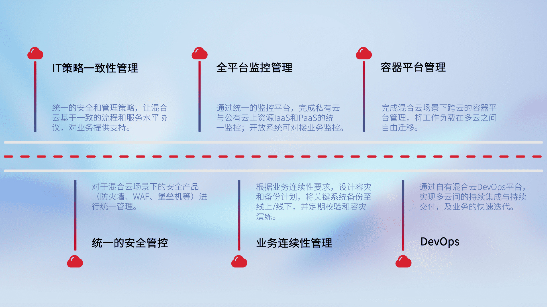 通过多云纳管,,,,以统一的资源数据模型把客户的云资源进行抽象和封装,,进而实现对多云资源的统一操作,,保障云资源管理的可靠性、、、、稳定性与可用性。。。量身定制化运维内容,,配置、、、开发运维、、、、补丁管理、、、备份、、、、监控、、、认证和访问管理、、审计和日常巡检等,,,,保障在用云过程中的可靠度,,稳定度以及高可用率。。