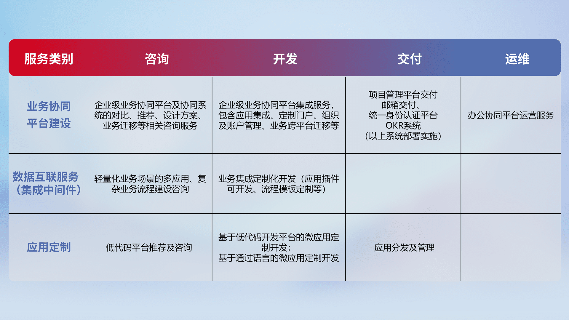 针对钉钉、、、、企微、、、IDaas等平台级产品提供产品的规划、、、方案、、交付、、、、定制化开发等服务,,,,实现如统一协同办公、、、智能客户服务、、混合会议管理、、、、智能数据查询、、等业务场景,,,实现数字化转型。。